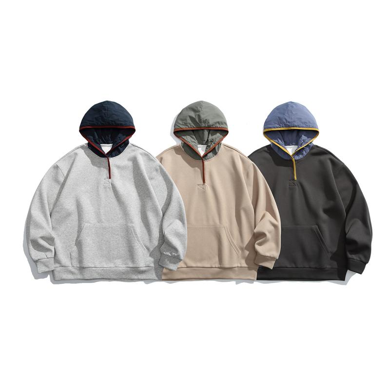 パーカー メンズ レディース フード付き プルオーバー 長袖 ピンカラー コットン ルーズフィット カジュアル アウター 秋 グレー カーキ 切り替え ストリート ファッション 普段使い