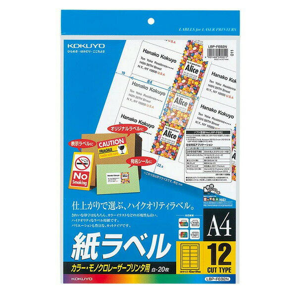 【A4・12面・角丸】KOKUYO/カラーレーザー&カラーコピー用 紙ラベル LBP-F692 12面 角丸 20枚 カラーレーザー用ラベルの定番 コクヨ