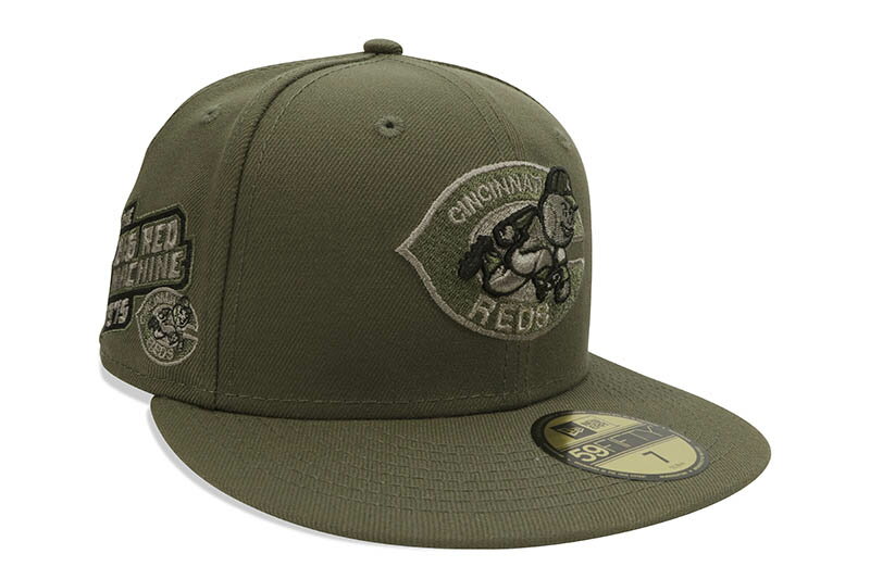 NEW ERA CINCINNATI REDS 59FIFTY FITTED CAP (1975 THE BIG RED MACHINE CUSTOM SIDE PATCH/WOODLAND CAMO UNDER VISOR & SWEATBAND/OLIVE)ニューエラ/フィッテッドキャップ/MLB/シンシナティレッズ/オリーブ/ツバ裏&スウェットバンド ウッドランドカモ