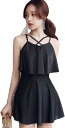 水着 レディース ワンピース水着 体型カバー 可愛い 無地 オールインワン ショートパンツ付き(ブラック, L)