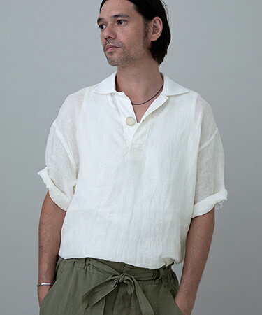 00:WHITE 31:BEIGE千鳥 05:BLACK ▼製品説明 【by CAMBIO】 --CAMBIO -- LINENSHEER POLO00:WHITE H175cmのモデルが48サイズを着用31:BEIGE千鳥 H175cmのモデルが48サイズを着用05:BLACK H175cmのモデルが48サイズを着用大きく1つだけ配されたボタンがアクセントとなったミニマルなデザインです。ムラの強い洗いをかけたリネン素材を使用し、独特の風合いと上質な質感を実現しています。リネン特有のシャリ感と清涼感が春夏の着こなしに軽やかさをもたらし、インナーとのレイヤードが美しく決まる設計となっています。この透け感が、レイヤードした際の重なりの美しさを際立たせ、単体では得られない奥行きのあるスタイリングを可能にします。襟部分にはミリタリーらしさを感じさせるタックの入った横ゴム編みを施し、シンプルながらも機能的な美しさを追求しています。この1つのボタンが持つ存在感は想像以上に強く、全体のバランスを絶妙にコントロールしています。ミリタリーテイストのタック入り襟は、カジュアルな印象に適度な緊張感をもたらし、大人らしい洗練されたムードを演出します。このミニマリズムが現代的なスタイリングに馴染みやすく、さまざまなボトムスとの組み合わせを可能にします。控えめでありながらも確かな存在感を放ち、大人のワードローブに欠かせない洗練されたアイテムとして活躍します。ワンウォッシュ済みのため、家庭での洗濯による縮みもありません。 【EGO TRIPPING(エゴトリッピング)】アイテム一覧はこちらから ▼寸法(平置き) 46サイズ/身幅:60cm 身丈(F/B):72/74.5cm 袖丈:25.5cm 肩幅:53cm48サイズ/身幅:63cm 身丈(F/B):74.5/77cm 袖丈:26.5cm 肩幅:56cm ※製造元提供。 素材 麻100%