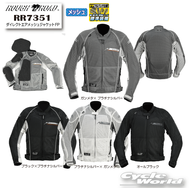 ◆RR7351 ダイレクトエアメッシュジャケットFP◆圧倒的な通風性を実現涼しさを極めた快適サマージャケット安心安全のフルプロテクション仕様究極のメッシュジャケット”がコンセプト。ライディングへの集中を妨げる酷暑から、ライダーを解放するのがこのジャケットの使命です。ビッグホールメッシュ生地をメインに使用することで、大量のフレッシュエアを導入しボディをクールダウン。加えて裏地を省くことにより抜群の放熱性を誇り、暑さによる集中力の低下を最小限にします。プロテクションパッドのフィット感を高め、ばたつきを抑えるアジャストフラップを腕部分に2箇所装備。さらには胸・肩・肘・脊椎にエアスルーパッドを標準マウント、エアスルーパッドのフィット感を高めばたつきを抑えるアジャストフラップを腕部分に2箇所装備。通気性をとことんまで突き詰めた、”放熱”するために生まれた真夏対応のジャケットです。 ■品番:RR7351■品名: ダイレクトエアメッシュジャケットFP■COLOR: オールブラック、ブラック×プラチナシルバー、ガンメタ× プラチナシルバー、プラチナシルバー× ガンメタ■SIZE:S、M、L、LL、XL、BM、BL、BLL■MATERIAL: 表地/ポリエステル 裏地/ポリエステル 襟裏/ポリエステル(吸汗・速乾)■PROTECTOR: 胸・肩・肘・脊椎パッド標準装備-----------------------------------------------------------------------------------------------------※ブラウザやお使いのモニター環境により、掲載画像と実際の商品の色味が若干異なる場合があります。商品詳細画像は今シーズン展開外カラーを掲載していることがあります。掲載の価格・デザイン・仕様について、予告なく変更することがあります。あらかじめご了承ください。商品の詳細に関しましてはメーカーサイトをご確認頂ますようお願い致します。★送料・納期などの注意点につきましては必ず弊社会社概要ページの「ショップからの重要なご案内」をお読みいただき注文をお願いいたします。-----------------------------------------------------------------------------------------------------