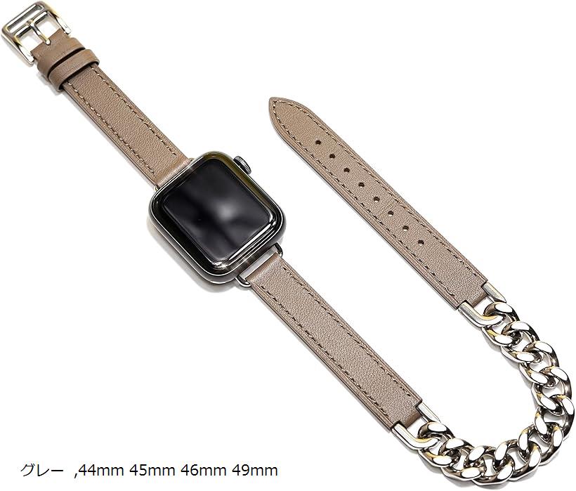 Apple watch チェーン & レザー ベルト おしゃれ アップルウォッチ バンド ステンレス 本革/シルバー レディース ギフト プレゼント 44mm 45mm 46mm グレイ (グレー, 44mm 45mm 46mm 49mm)