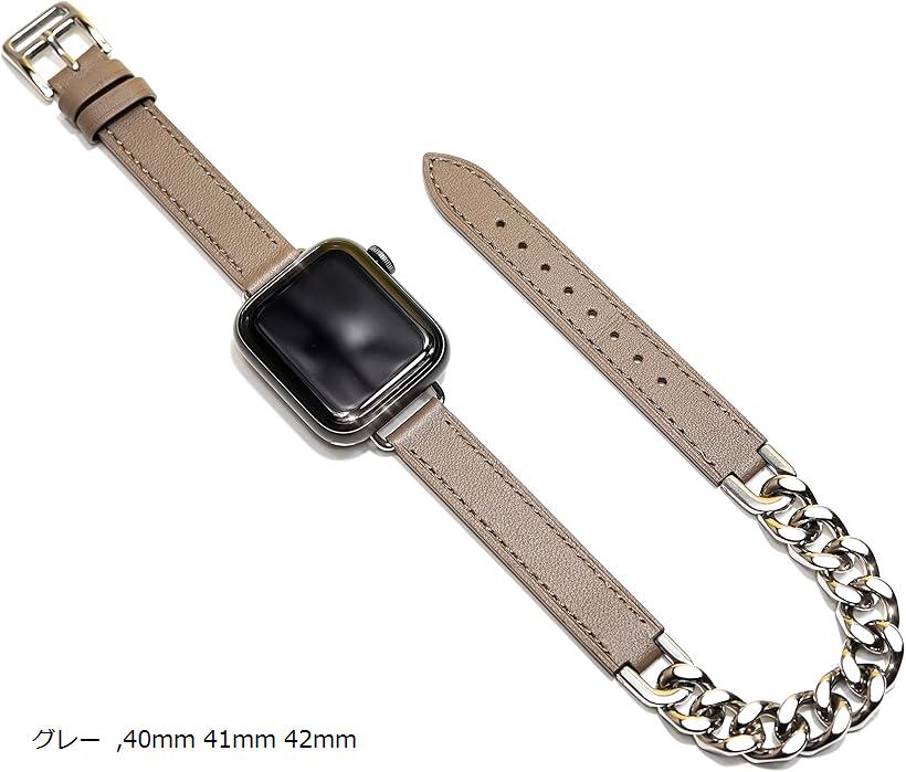 Apple watch チェーン & レザー ベルト おしゃれ アップルウォッチ バンド ステンレス 本革/シルバー レディース ギフト プレゼント 40mm 41mm 42mm グレイ (グレー, 40mm 41mm 42mm)