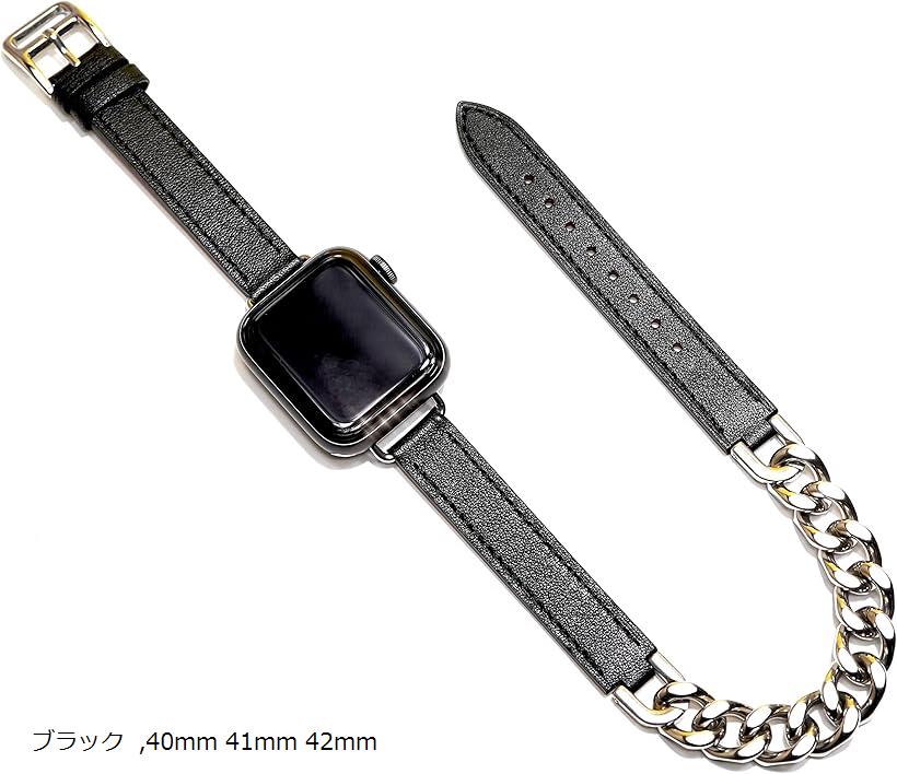 Apple watch チェーン & レザー ベルト 40mm 41mm 42mm おしゃれ アップルウォッチ バンド レザーバンド/ステンレス 本革/シルバー ブラック Series 10 9 (ブラック, 40mm 41mm 42mm)