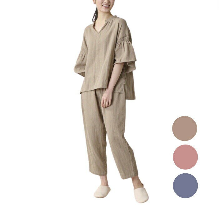 リオグループ summer/roomwear M/L パジャマ シャーリング フレア袖 cotton100% 着脱も楽チン 上下セット 選べる3color D38502-27 レディース 半袖