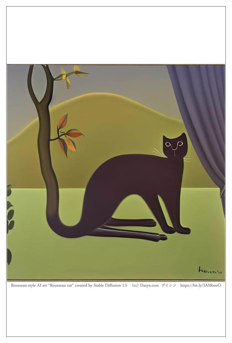 AI アート作成用のプログラム Stable Diffusion 1.5 (または 2.0) がデザインした猫アート絵はがきです.Stable Diffusion に「Henri Rousseau cat」ということば (prompt) をいれてデザインさせました. ルソー風ですがルソーの絵画ではありません. サイズは通常のはがきサイズ (148 mm × 100 mm) で,厚みも官製はがきと同程度です. はがきとしては,63 円切手を貼れば,縦書きでも横書きでも自由に使えます. 使用例は下の例を参考にしてください. 裏には印刷がなくてペンや鉛筆で書けるので,はがき以外の目的にも自由に使えます. 表に余白がある図柄では,余白の部分にもペンで自由に書けます. 原画は AI アート・サイト NightCafe で公開しています: creator.nightcafe.studio/creation/vulAy4M6MSiZV7abMviD ただし,絵はがきでは超解像という技術をつかって原画より解像度を 4〜8 倍に (こまかく かつ なめらかに) しています.AI アート絵はがき AI にいろいろな絵はがきをデザインさせました