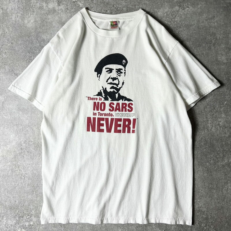 No... f060630-05 age... 2000年代 brand... ─ color... ホワイト material... 100% COTTON size... L ─ description ─ 00年代のフセイン大統領メッセージプリントTシャツです。 ボディは、FRUIT OF THE LOOM(フルーツオブザルーム) 確りとしたヘビーウェイトコットン素材を使用 合わせやすいホワイトカラー フロントにイラクの独裁者サダム・フセイン "There is NO SARS in Toronto. NEVER!" 「トロントにはSARSはありません!」 2003年当時、流行したSARSと大量破壊兵器の保有を否定したフセインの演説をかけたプリントです。 2003 TSE コピーライト入り 当時の情勢を表したデザイン アメリカ古着らしい良いデザインの一枚です。 ─ measuring size ─ 着丈... 70cm 身幅... 55cm 肩幅... 51cm 袖丈... 22cm ─ condition ─ 使用感。ネックリブに軽い薄汚れ。