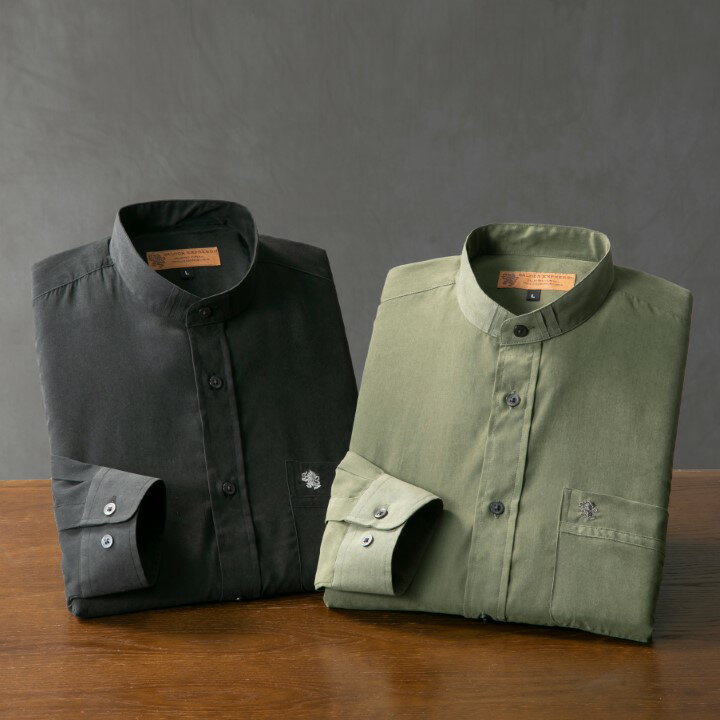 早割りSALOON EXPRESS/サルーンエクスプレス スエード調スタンド襟シャツ2色組 着心地も良く、肌触りがなめらかなスエード調シャツ 個性的なスタンド襟がダンディーな男のお洒落を演出。 胸ポケット部分のブランド刺しゅうが高級感を醸し出します。 装いに合わせてコーディネイトを楽しめる2色のカラーをご用意しました。