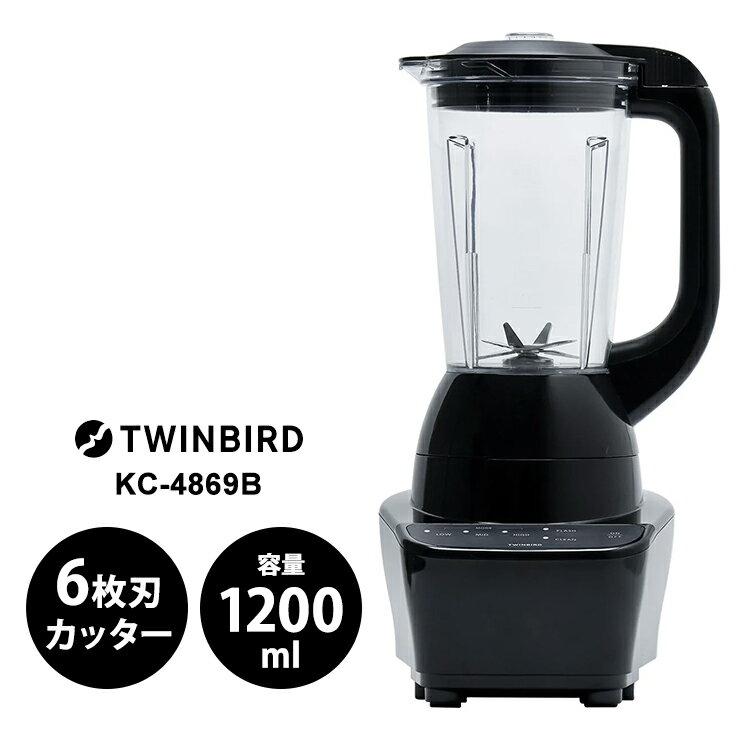 家電>キッチン家電>ジューサーミキサーパワフルミキサー ブラック 1200ml レシピブック付き TWINBIRD (ツインバード)食材をなめらかに仕上げる、パワフル&高速回転TWINBIRD (ツインバード)商品コード(JAN・EAN・UPC):4975058486914メーカー型番:KC-4869BKC4869B<特長>●毎分24000回(無負荷時・本体のみ)の高速回転モーターで野菜や果物を口当たりよく混ぜ合わせます。●6枚のカッター刃が食材をしっかりとカットし、たっぷりの野菜や果物をなめらかなスムージーに仕上げます。●速度は3段階の切替が可能で、食材に合わせてお好みの仕上がりが選べます。●ガラスよりも軽く、透明・耐久性に優れたコポリエステル樹脂(PCT)をミキサー容器に採用。●低速で間欠運転するクリーニングモード搭載で、カッター刃に触れずにミキサー容器を洗浄できます。●季節の食材に合わせた特製レシピブック付。●ふたをしないと通電しないロック機構。●止め忘れを防ぐオートストップ機能。●押している間だけ高速回転で運転するFLASH機能。●調理物をかき混ぜられる押し棒付。<仕様>◆製品寸法:約230x235x445mm(WxDxH)◆質量:約3.8kg◆電源:AC 100 V 50/60Hz◆定格消費電力 「HIGH」 800W (表示値・定格容量負荷時) 「MID」 600W 「LOW」 400W 「CLEAN」 250W◆回転数(定格水負荷時) 「HIGH」 約14000rpm 「MID」 約11000rpm 「LOW」 約 8000rpm◆回転数(無負荷時・本体のみ) 「HIGH」 約24000rpm 「MID」 約21500rpm 「LOW」 約18000rpm◆定格時間:4分◆電源コード長:約1.4m◆ミキサー容器容量:1200ml◆付属品:押し棒、レシピブック(100レシピブック)、取扱説明書(保証書付)食材をなめらかに仕上げる、パワフル&高速回転