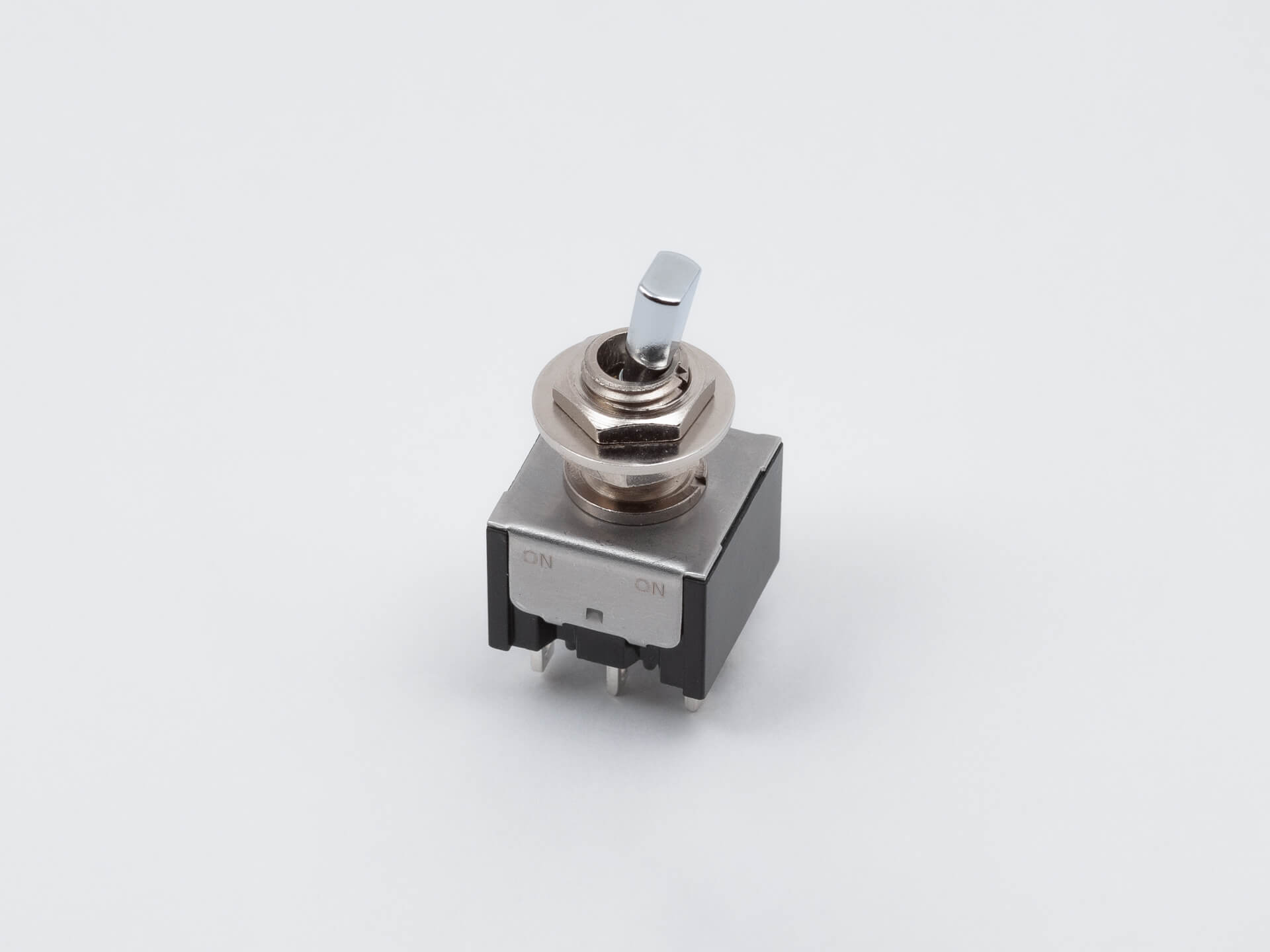 SNAPPERに採用しているショートフラットレバーのミニスイッチ。レバー部はクロームメッキ、ネジ部やナットワッシャーはニッケルメッキです。 仕様:ON-ON 6pin、2極双投 付属品:ナット 2枚、ワッシャー 1枚、内歯ワッシャー 1枚 ※在庫が無い場合はお取り寄せにお時間を頂く場合がございます。