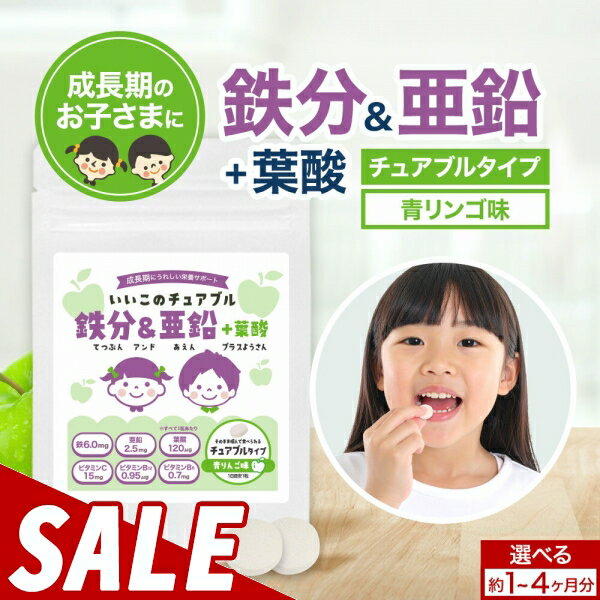 【最大20%OFFセール】子供 こども サプリ 鉄分 & 亜鉛 + 葉酸 青りんご味 30粒 / 120粒 約1〜4か月分 鉄分不足 鉄 チュアブル サプリメント 亜鉛サプリ 鉄分サプリ 葉酸サプリ 栄養補給 栄養補助 成長 美味しい オーガランド 1000円ポッキリ 送料無料 nkdy