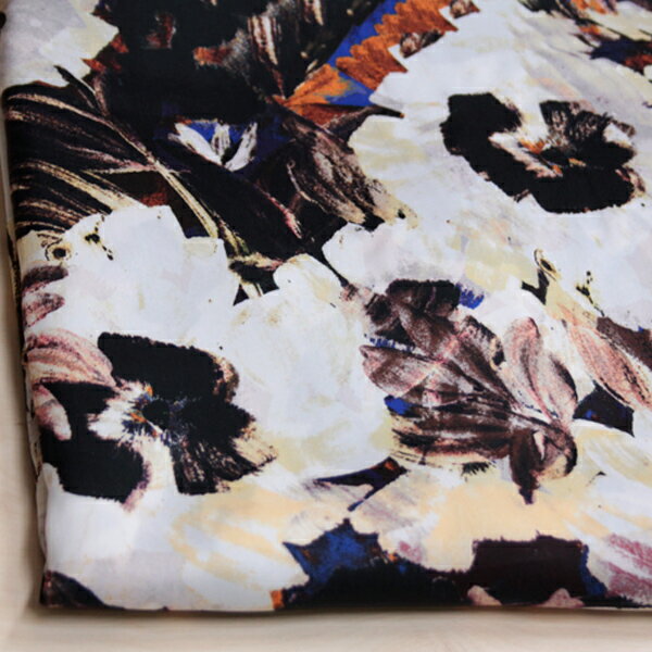 ポリエステルサテン 大判モードフローラルプリント モノトーン&ブルーオレンジ MICBY SATIN A[オーダーカット生地 10cm単位] 【RCP】