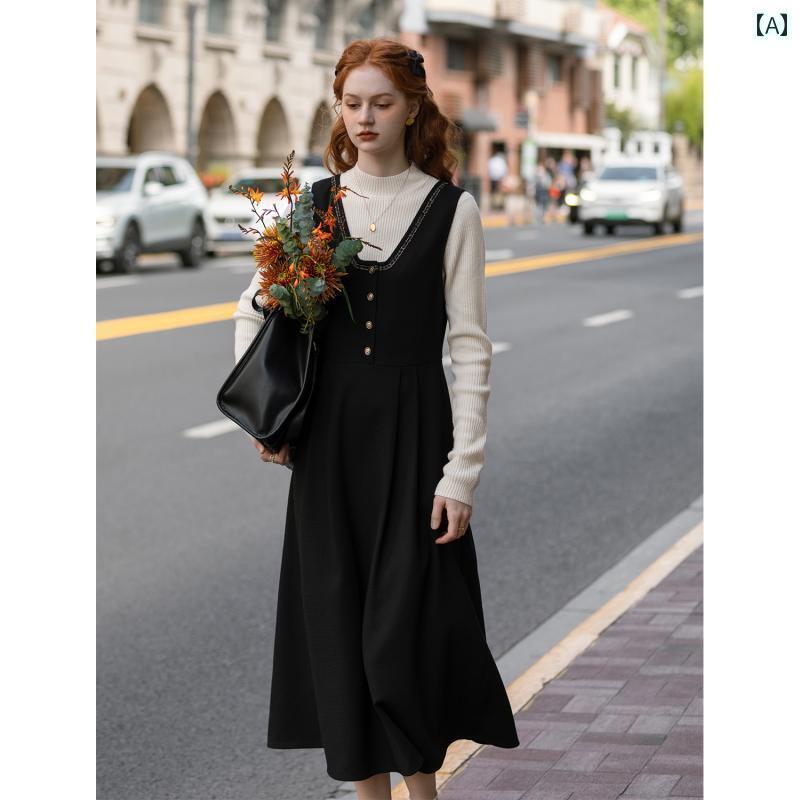 ジャンパースカート 大人 レディース 秋冬 レトロ Vネック Aライン ミモレ丈 ボタン エレガント 黒
