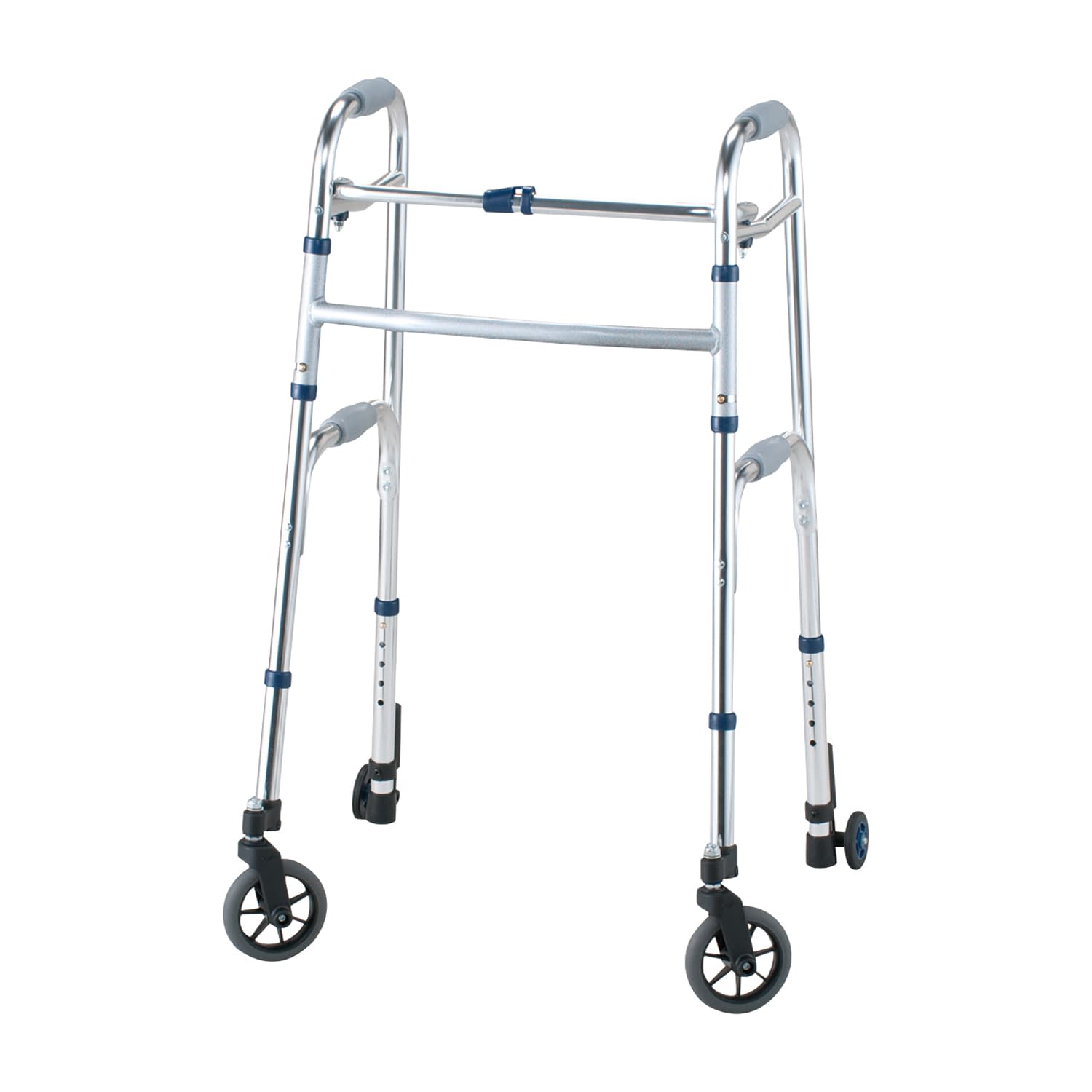 商品説明★ スムーズに動きやすい5インチ大型ゴムキャスターとキャスター付ストッパーで方向転換もスムーズな4輪タイプ。★ 前輪:5インチ・大型ゴムスイングキャスター★ 後輪:3インチ・プラスチックキャスター付ストッパー★ スムーズ歩行★ 室内・屋外両用タイプ★ グリップの高さ:2.5cmずつ5段階調節可能★ コンパクト収納:薄型折りたたみ★ グリップ:ドライバーで交換OK★ ウォーカースイングキャスタータイプ1.前輪:360°回転するスイングキャスタースイングキャスターなので方向転換もスムーズです。2.後輪荷重がかかるとストッパーが作動します。※凹凸道や坂道などでは使用しないでください。※荷重をかけた状態(ストッパーが作動した状態)で歩行器を無理に動かさないでください。★ 仕様変更前輪フォーク部をご利用様や周囲にやさしい樹脂材に仕様変更しました!※固定型歩行器用の脚先パイプセットは付属されておりません。スペック* 重量:4.0kg* 収納時サイズ:W67.5×D12×H91.5cm* 下段グリップ:50〜60cm* 前輪:5インチ* 後輪:3インチ