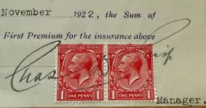 額装された1ペンス・ブライト・スカーレットのキング・ジョージ5世切手 SG357 1912-22年 2枚