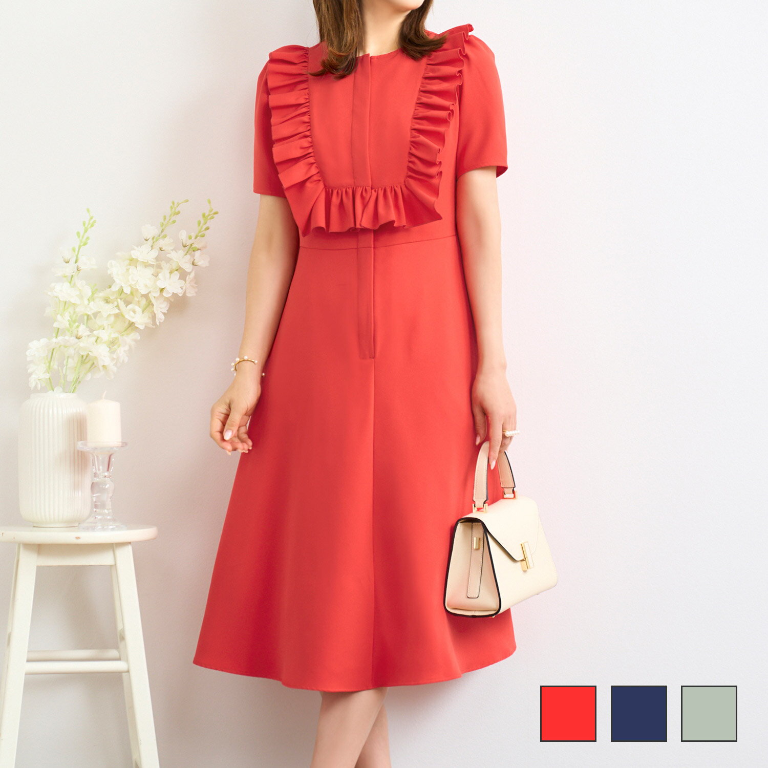 ワンピース レディース かわいい きれいめ 大人 オフィス 赤 春夏秋 フィット&フレア 半袖 上品 膝丈 ジョイントスペース フロントフリル エアリー ストレッチ ワンピース Prima Scherrer 全3色|psc331-0957【1】