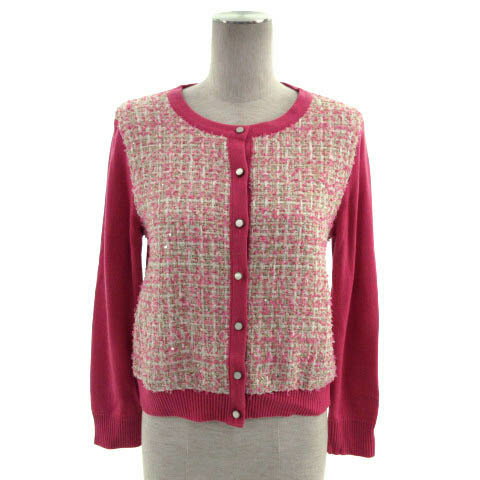 【中古】プリマシェレル Prima Scherrer カーディガン ニット 丸首 長袖 ツイード切替え 日本製 ピンク マルチカラー M レディース 【ベクトル 古着】 230509