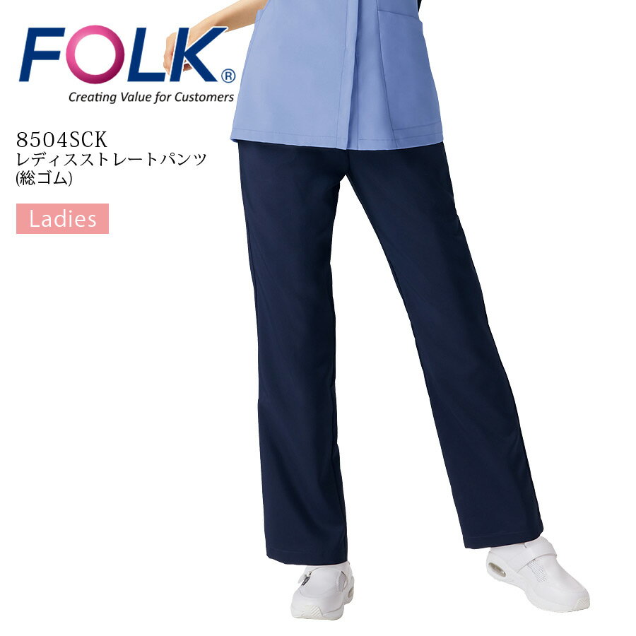 レディース ストレートパンツ 総ゴム カチオン染料仕様 フォーク 8504SCK 医療用白衣 看護師 ナース 病院 クリニック ズボン 女性用 吸汗 速乾 ワイン ネイビー FOLK