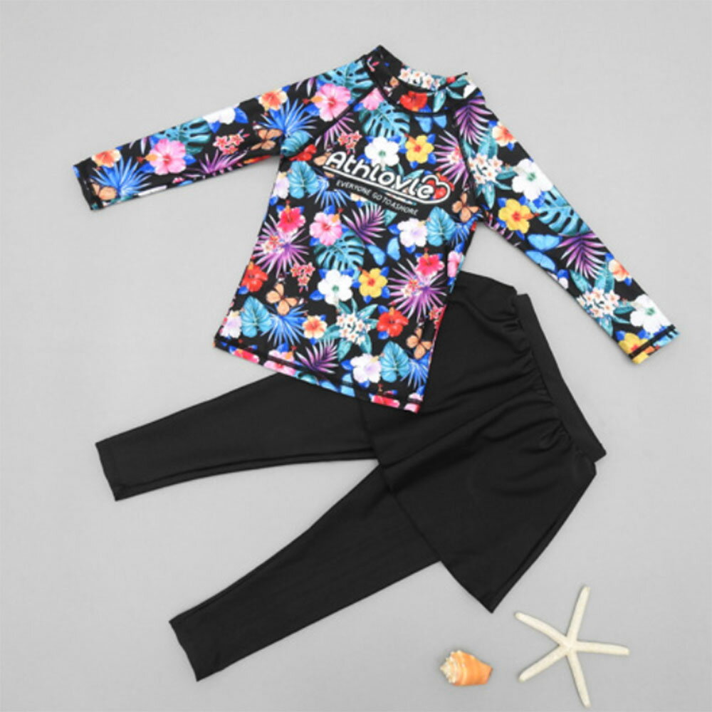 長袖ラッシュガード レギンススカート 上下セットキッズ 子供用 水着 ハイビスカス柄 ブラック 黒