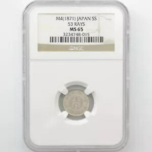 4th year of the Meiji era Asahi Oaza 5 sen silver coin NGC MS65商品についてNGC認証1871年宗派は適用されません構成は適用されませんグレード MS 65製造国・地域 日本MPN は適用されません注意事項※以下の注意事項をご理解のうえ、ご購入ください■ 鑑定済みコイン・紙幣について各種コイン・紙幣の鑑定機関(NGC、PCGS、PMGなど)は、収集品の真贋鑑定およびグレーディングを行う専門機関です。鑑定後の商品は、専用ケース(スラブ)に封入され、状態を示すグレードが付与されます。■ グレードについてグレードはコイン・紙幣自体の状態を評価するものであり、ケース自体の品質や状態を保証するものではありません。製造・輸送時の影響により、以下のような状態が発生する場合がございます。- 軽微なスレ傷・拭き傷(特に光の角度で見えるもの)- ケース内部のホコリ・小さな異物(鑑定機関の検品基準を満たしている場合)- ラベルのズレ・わずかな傾きこれらは鑑定機関の基準内であり、返品・交換の対象とはなりませんのでご了承ください。■ ラベルの種類について各鑑定機関では、コイン・紙幣の状態や鑑定の結果に応じて異なるラベルが付与されます。- 通常ラベル(Standard/Regular):一般的なグレード付き鑑定済みコイン・紙幣- オーセンティック(Authentic):グレードなしで真贋のみ保証- 詳細グレード(Details):クリーニング跡やエッジのダメージがあるが本物と認定- 特別ラベル(Special Label):記念版や特定のデザインの限定ラベル - 例:NGC「Early Releases」「First Releases」、PCGS「First Strike」 などグレードやラベルの種類は、商品画像および説明文をご確認のうえ、ご購入ください。■ 在庫状況について当店の商品は海外から取り寄せております。ご購入のタイミングによっては在庫切れとなる場合がございます。その際はご連絡のうえ、ご注文をキャンセルさせていただく場合がございますので、あらかじめご了承ください。■ ご注文後のキャンセルについてご注文と同時に商品のお取り寄せを開始するため、お客様都合によるキャンセルは承っておりません。■ 配送についてお届けまでに通常2〜3週間ほどかかります。海外の祝日や天候、税関手続きにより通常より配送が遅れる可能性がございます。■ 保証について商品説明に英語で「保証(warranty)」と記載があっても、日本国内では適用されませんのでご了承ください。 当店では、商品到着後7日以内の初期不良に限り、対応させていただきます。 (返品規約の詳細については、楽天市場内の会社概要欄下部をご参照ください。)■ 商品の色・素材感について撮影環境やモニター設定により、実際の商品と色味や質感が異なる場合がございます。■ 価格変動について希少性の高い商品は市場価格の変動により、追加料金をお願いする場合がございます。追加料金に同意いただけない場合には、ご注文のキャンセルが可能ですので、ご安心ください。■ その他サービスについて海外製品の輸入代行も承っております。ショップに掲載されていない商品でもお探し可能ですので、お気軽にご相談ください。尚、業者販売(業販)や複数購入の場合、割引対応も可能です。ご希望の方はお問い合わせください。