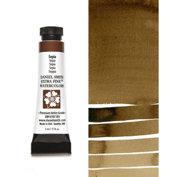 Sepia 5ml Tube - DANIEL SMITH Extra Fine Watercolor SKU: 284610103 Pigment: PBr 7, PBk 9 | Series: 1 Lightfastness: I - Excellent Transparency: Semi-Transparent Staining: 2-Low Staining Granulation: Granulating Low staining and lightfast, this semi-transparent black-brown is a palette basic. From its rich, deep state in concentrated strokes, Sepia can dilute to a subtle mushroom hue. Enjoy this transition in washes from near to far or from shadow to light in plowed fields and farm subjects. Fence posts - the wet, West Coast kind - are fun to paint, as are bulrushes and cattails. Try each wet into wet.