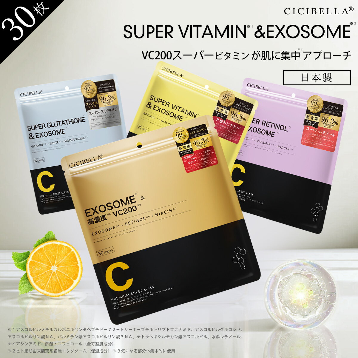 \待望の新シリーズ誕生!/CICIBELLA Sheet Mask シシベラ シートマスク 韓国 コスメ 30枚 大容量 ビタミン スーパービタミン×EXOSOME スーパーレチノール×EXOSOME スーパーグルタチオン×EXOSOME 高保湿 VC200xヒト幹細胞 フェイスマスク 顔パック フェイスパック