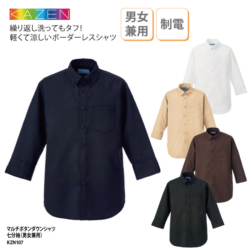 マルチボタンダウンシャツ 七分袖 KAZEN シャツ ボタンダウン 男女兼用 メンズ レディース ホワイト ブラウン ブラック ベージュ ネイビー 飲食 厨房 カフェ レストラン 日よけ カフェ 軽い 涼しい ボーダーレス おしゃれ シンプル 店員 KZN107 刺繍 プリント