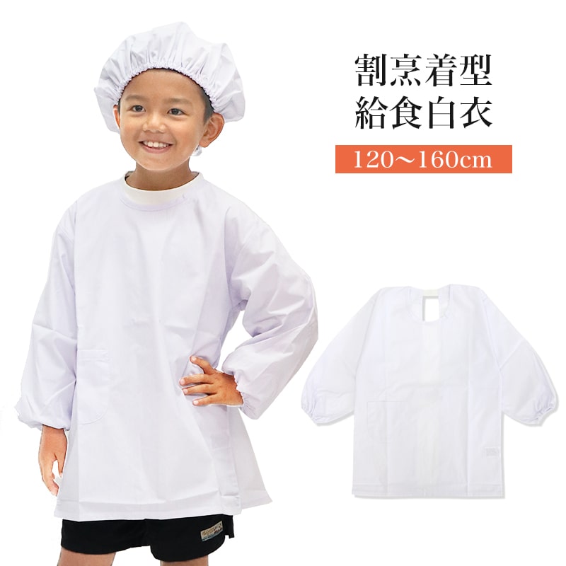 給食割烹着清潔感のある白い割烹着型の給食白衣。首はゴム仕様だからスッポリかぶるだけ。背中はマジックテープ仕様でお子様ご自身でも簡単に着ることができます。商品詳細 <内容>割烹着型 給食白衣※給食帽子・給食巾着は商品に含まれません。■給食割烹着の単品購入はコチラ⇒■給食帽の単品購入はコチラ⇒■給食袋の単品購入はコチラ⇒■給食割烹着3点セットの購入はコチラ⇒<仕様>[120サイズ]身長目安:115-125cm着丈59.5cm / 身幅41.5cm / アームホール23cm / 裄丈55cm[130サイズ]身長目安:125-135cm着丈62cm / 身幅43.5cm / アームホール24cm / 裄丈57cm[140サイズ]身長目安:135-145cm着丈66cm / 身幅45.5cm / アームホール25cm / 裄丈62cm[150サイズ]身長目安:145-155cm着丈70.5cm / 身幅47.5cm / アームホール26cm / 裄丈67cm[160サイズ]身長目安:155-165cm着丈74cm / 身幅49cm / アームホール27cm / 裄丈72cm<品質表示>ポリエステル65% 綿35%インドネシア製 注意事項 ●お買い物方法や商品・送料などについてのお問い合わせは当店のカスタマースタッフまでご連絡ください。●メールでの受付は24時間行っております。メールでのお問い合わせの際には、必ず商品名・サービス名等をご明記ください。●当店の記載している実寸ですが、一部商品のみ採寸した結果です。商品により個体差がありますので、多少の誤差がございます。表記サイズは目安としてお考えください。サイズに不安のあるお客様はスタッフまでお問合せください。●モニターの明るさの具合によって実際のものと色が異なる場合がございます。詳しい情報は、スタッフまでメールにてお問い合わせください。
