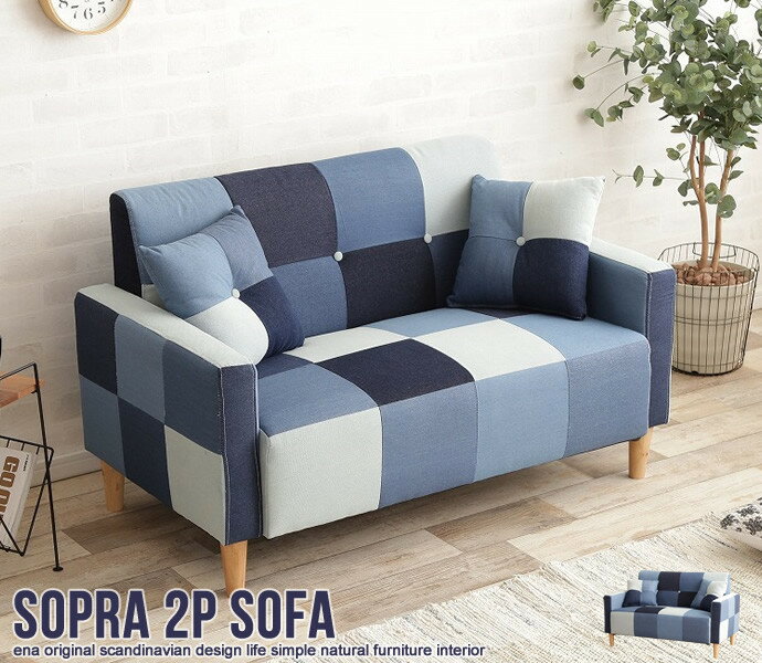 デニム生地を継ぎ合わせたおしゃれなパッチワークソファ Sopra 2人掛け ナチュラル 北欧 海外風インテリアに合わせやすい クッション付き アクセントソファ ファブリック素材 Sバネ採用 程良い硬さ コンパクト設計 脚を外してロータイプソファ ワンルーム 二人掛け ECR131006