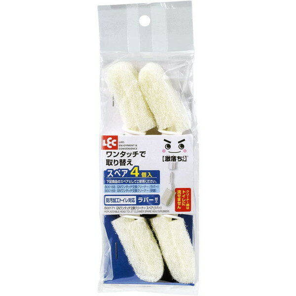 商品説明★ 「激落ちくん GN ワンタッチ交換クリーナー(ラバー)」の、取替え用トイレブラシのスペア(4個入)。取替え用スペアは、本体に差し込むだけで使用できます。ブラシはラバータイプでキズを付けにくく、汚れをしっかりこすり取ります。防汚加工のトイレ(便器)にもご使用できます。ブラシは便器のフチも洗いやすいななめ形状です。※ブラシはトイレには流せません。必ずゴミ箱に捨ててください。スペック* 一つあたりサイズ: (約)幅3×奥行4×高さ10cm* 材質…・ヘッド: ポリプロピレン・クリーナー: ポリエステル、ナイロン混紡不織布(研磨剤入り)* 耐熱温度…・ヘッド: 70度・クリーナー: 60度
