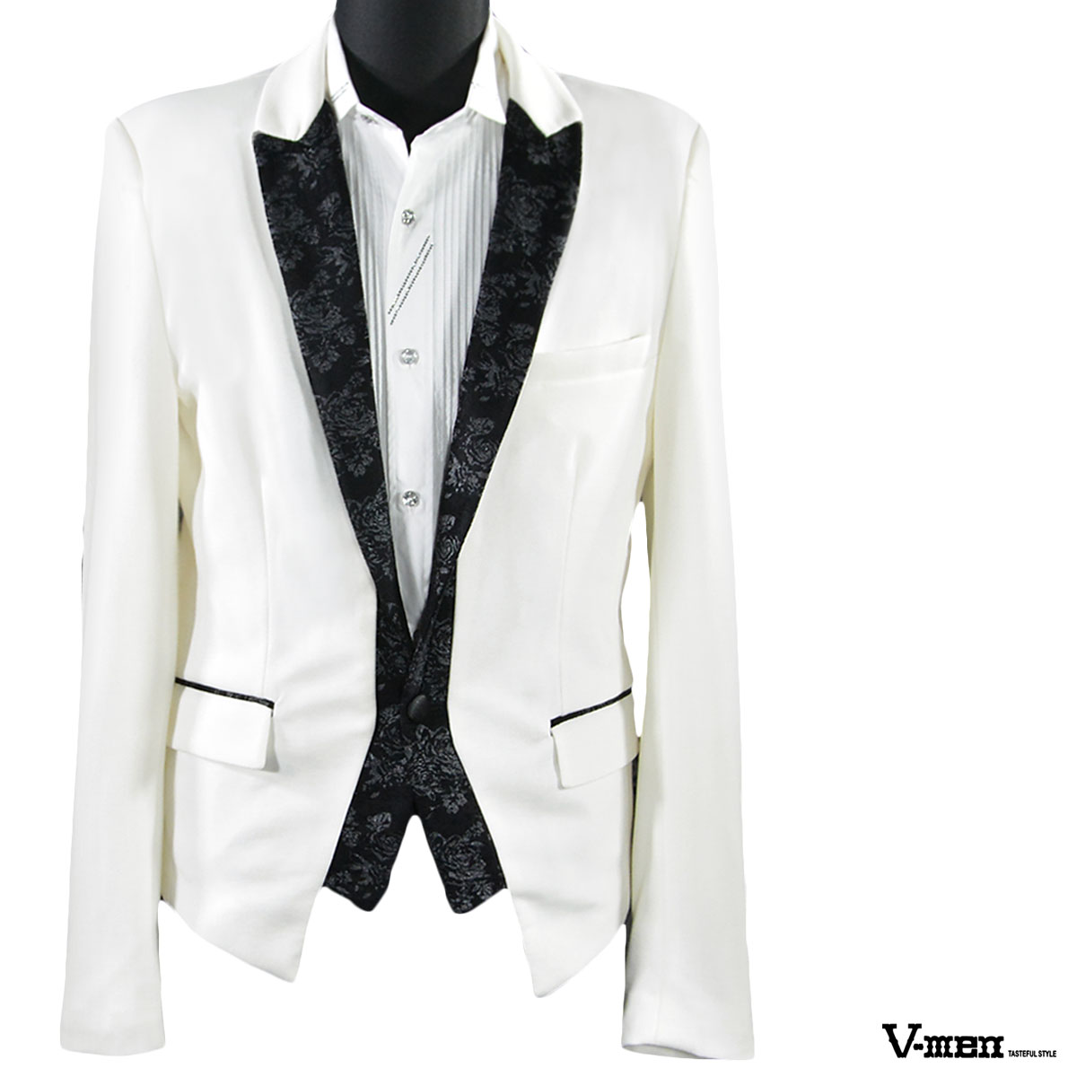カットジャケット スペンサー レイヤード 薔薇 ジャガード 切替 ショート丈 無地 ポンチ 1釦 スリム 衣装 パーティー ジャケット mens ファッション おしゃれ (ホワイト白) 952584
