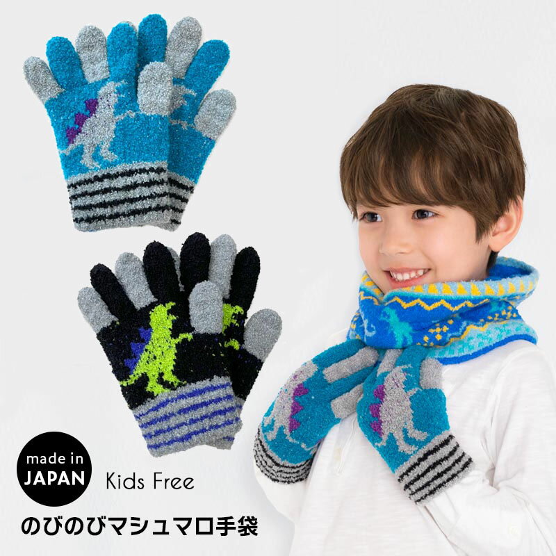 【キッズ用手袋】のびのびマシュマロ手袋 ダイナソーA【 日本製 てぶくろ 伸びる手袋 五本指 子供用 防寒 男の子 ボーイズ 通園 通学 幼稚園 恐竜 ダイナソー 青 黒 ブルー ブラック かっこいい 】sps