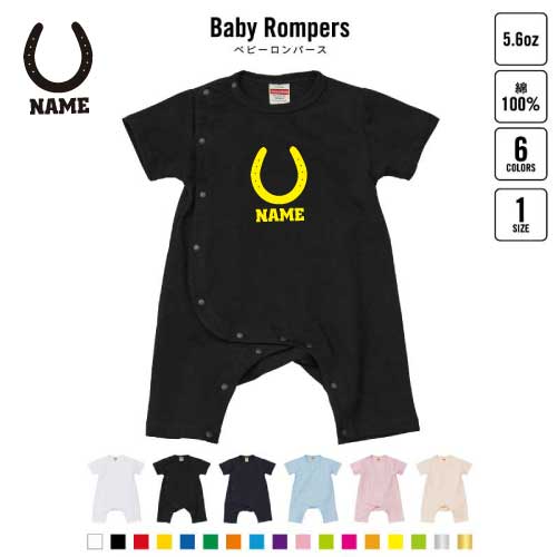 「蹄鉄」名入れベビーカバーオール 前開き 全身開閉 ロンパース/男の子 女の子 おしゃれ ベビー服 80サイズ 出産祝い 綿100% お名前入りギフト キッズサイズ 馬 ウマ 競馬グッズ 競馬ファン 馬好き名前入り おなまえ