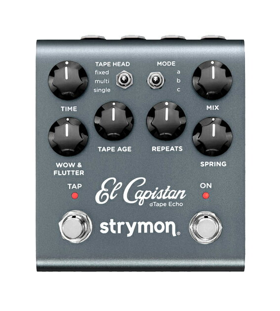 製品概要 El Capistanは、3つの異なるテープマシンのタイプを切り替えることができ、それぞれにユニークなモードを備えています。テープの質、マシンの劣化具合、トーンなど細かな音の作り込みまで思い描く通りのサウンドメイクを究めることが可能です。 新品のエコーマシンが持つフルレンジの安定したサウンドから、メンテナンスが必要なほどくたびれて不安定なユニットのニュアンスまで再現します。この1台で新品のテープ特有のフルボディのサウンドも、使い古されたテープのノイジ―でくもったサウンドも手に入ります。 こだわり抜かれたdTape™テクノロジーとパワフルなARM DSPにより、これまでのテープマシンでは再現し得なかったようなテープマシンエフェクトから、テープスタイルのルーパーエフェクトまで幅広く提供します。本物のテープマシンのようなメンテナンスの心配なく、最新の技術で最高のビンテージ体験をお楽しみいただけます。 特徴・仕様 ・ハイ・インピーダンス超低ノイズClassA JFETプリアンプ入力 ・ロー・インピーダンス・ステレオ出力 ・TRSエクスプレッションペダル、Strymon MiniSwitch、MultiSwitch Plus、TRS MIDIが接続可能なエクスプレッション入力 ・コンピューターとのMIDIコネクション、ファームウエアのアップデートが可能なUSB-Cジャック搭載 ・独立のTAPテンポスイッチとOn/Offスイッチ ・300のプリセット保存とMIDIフル対応 ・超低ノイズ、ハイパフォーマンスの24-bit 96kHz、A/D&D/Aコンバータがもたらす妥協のないオーディオ・クオリティ ・ハイパフォーマンス 520MHz ARM スーパー・スカラー・プロセッサー ・32-bit浮遊演算プロセッシング ・20Hzから20kHzのフリーケンシー・レスポンス ・9VDC(センターマイナス)300mA (別売) ・Designed and built in the USA現代に甦る、最強のテープマシン