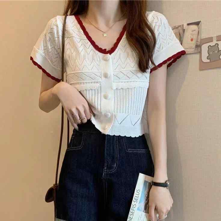 ニット レディース 春夏 薄手 Vネック カーディガン 半袖 トップス 接触冷感 ポリエステル きれいめ かわいい オフィスカジュアル 私服名媛風 ホワイト ピンク ブルー イエロー