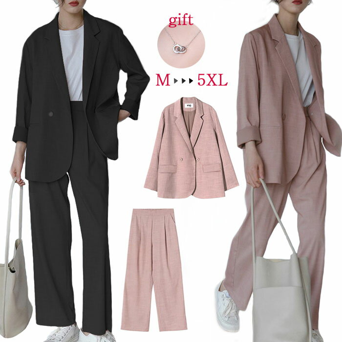 パンツスーツ レディース セットアップ フォマールスーツ 春 秋 大きいサイズ テーラード ジャケット おしゃれ ストレッチ ネックレス付 長袖 ロング丈 ゆったり 卒業式 入学式 洗える ビジネススーツ ママ リクルート オールシーズン対応 通勤 OL 黒 ピンク エレガント