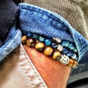 天然石のタイガーアイ風の茶褐色のストーンに大仏のビーズをセットした伸縮性のあるゴムの数珠ブレスレットと青色が綺麗なブルーのビーズにシルバーパーツをセットした数珠ビーズ2本の合計3本をセットにした大人スタイルのメンズファッションブレスレット。 手首からチラリと見えるおしゃれな大人スタイルのバングル。ゴム製なので伸縮性もあり、装着しやすい3連ブレスレット。1本ずつが独立しているので1個ずつでも使える。彼氏や男性へのプレゼントにも最適のブレスレットです。人気アイテム間違いなし。 スペックタイガーアイの大きさ:約9mmブルーストーンの大きさ:約8mmと6mm内径:55mm x 55mm素材テグス/ストーン/真鍮備考・表示は3個セットの価格です。・ハンドメイドの為多少サイズは異なります。