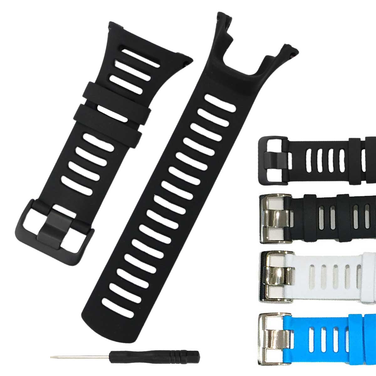 SUUNTO ラバー ベルト スント 腕時計 バンド ストラップ AMBIT AMBIT2 AMBIT2S AMBIT2R AMBIT3 AMBIT3 Sport HR AMBIT3 Peak AMBIT3 Run 対応 ・AMBIT AMBIT2 AMBIT2S AMBIT2R AMBIT3 AMBIT3 Sport HR AMBIT3 Peak AMBIT3 Run 対応の交換ストラップです。 ・シリコン素材なので、超軽量。手首に合わせて調整できるデザインです。 ・交換に必要なキット付で、すぐにカスタマイズできます。 ・丈夫で高品質の材質を採用していますので、耐久性に優れています。 ・シンプルなのでカジュアルなスタイルにもマッチするラバーベルトです。 ご購入から30日間はメーカー保証付きです。 メーカー希望小売価格はメーカーサイトに基づいて掲載していますb266-b269 ・SUUNTO AMBIT AMBIT2 AMBIT2S AMBIT2R AMBIT3 AMBIT3 Sport HR AMBIT3 Peak AMBIT3 Run 対応の交換ストラップです。・シリコン素材なので、超軽量。手首に合わせて調整できるデザインです。・交換に必要なキット付で、すぐにカスタマイズできます。・丈夫で高品質の材質を採用していますので、耐久性に優れています。・シンプルなのでカジュアルなスタイルにもマッチするラバーベルトです。 ◆対応モデル:Suunto Ambit/AMBIT 2/AMBIT 3 Peak/AMBIT 2 R/AMBIT 2 S/AMBIT 3 Sport/AMBIT 3 Run ◆内容:ラバーベルト、へクスローブドライバー1本※本商品はラバーベルトのみの商品です。本体・留め金具は付属しておりません。◆サイズ(約)(ベルトの長さ)最小11cm 最大20cm(ベルト幅)2.5cm※装着した状態のねじ穴からねじ穴までを測定 ◆重量(約):20g◆材質:シリコンラバー◆カラー:全3色(黒黒、白、水色) ※商品写真はできる限り実物の色に近づけるよう調整しておりますが、お客様のお使いのモニター設定、お部屋の照明等により実際の商品と色味が異なる場合がございます。 恐れ入りますが色味が理由によるご返品はお受けしておりませんので、予めご了承ください。 ご注文前に必ず確認下さい ●よくあるご質問●