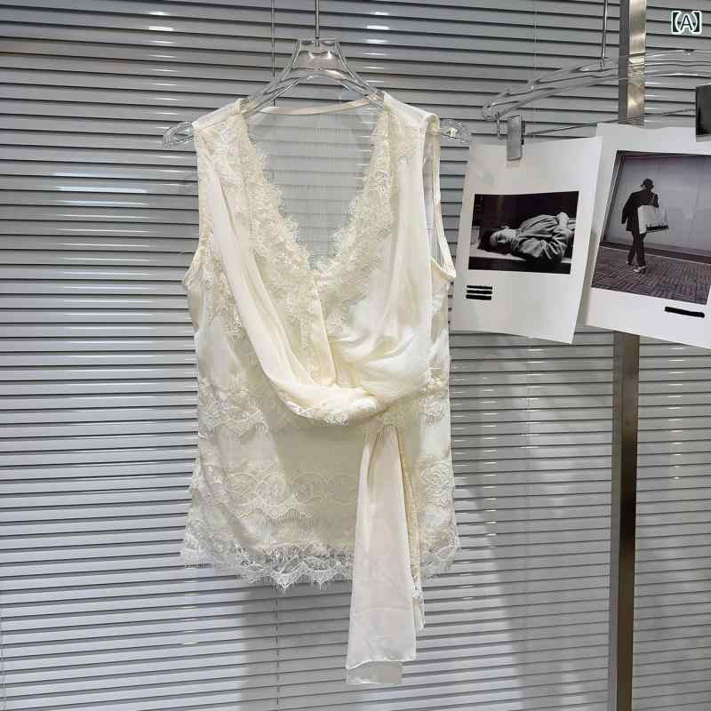 Vネック レース レディース スタイル 2025夏の フレンチ レディ Vネック レース スプライシング ストラップ ライト ベスト ブラウス