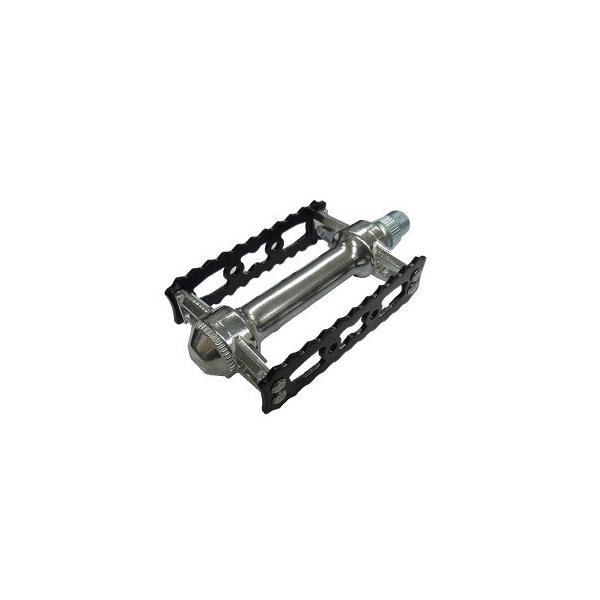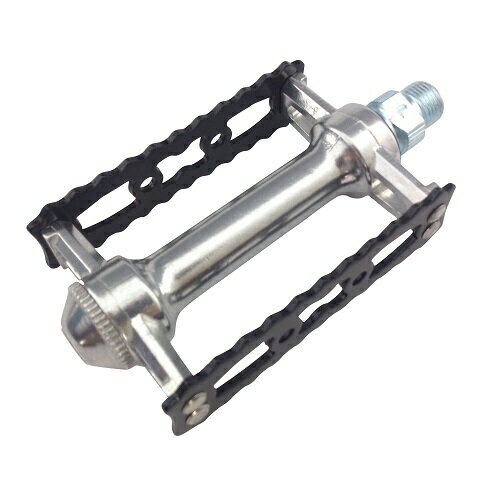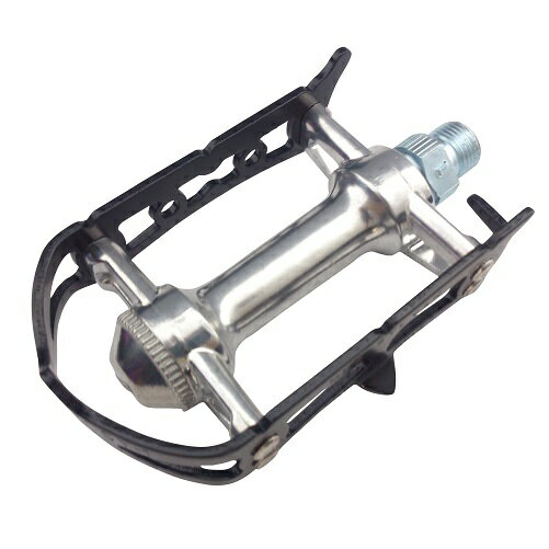 ミカシマペダルの定番商品シルバントラックです。 シルバンストリームとは逆に方踏みタイプですがピンが付いている分トークリップに入れやすいです。 ペダル本体にダブルストラップを通せるのでトークリップがシングルタイプでも安心!! ボディ:アルミ 側板:アルミ/アルマイト サイズ:W80 x L61 踏み面:片面 ベアリング:ボールベアリング トウクリップ装着:必須 リフレクター:取付可 重量:343g