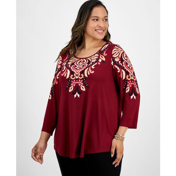 ジェイエムコレクション レディース カットソー トップス Plus Size Printed Scoop-Neck 3/4-Sleeve Top, Exclusively at Macy's Antique Red Combo