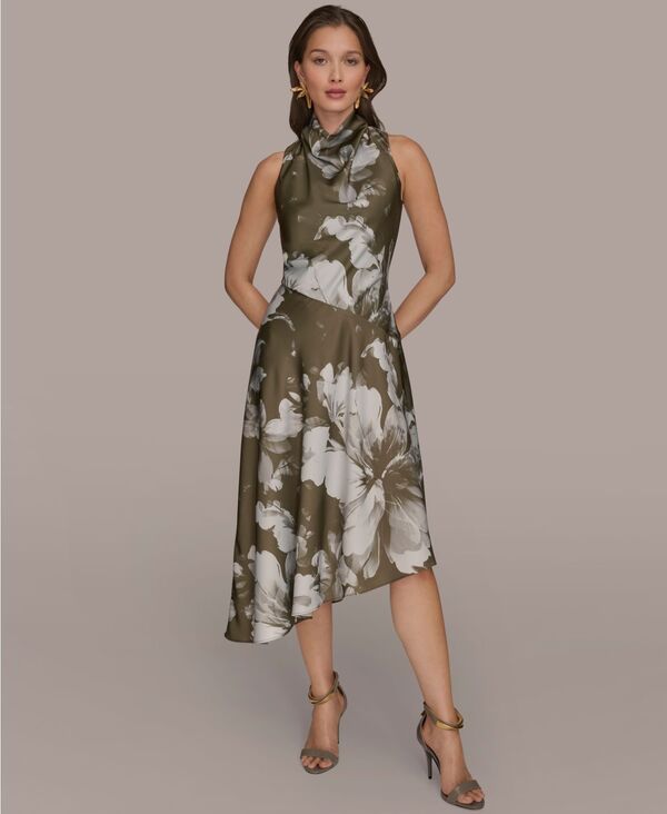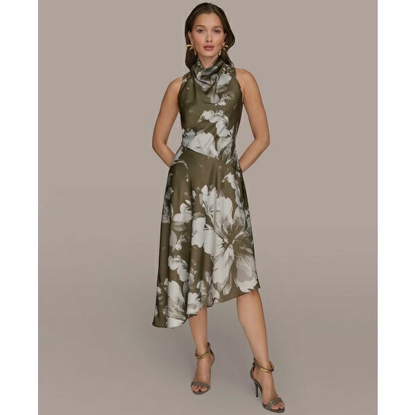 ダナ キャラン ニューヨーク レディース トップス ワンピース アシンメトリー ミディワンピース フラワー柄 プチ ミディ サテン フラワー Donna Karan New York Petite Satin Asymmetrical Floral Midi Dress Antique Green グリーン