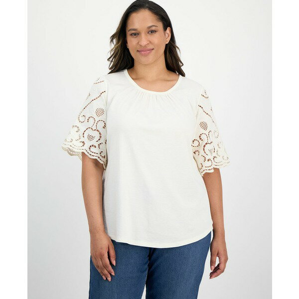 スタイルアンドコー レディース カットソー トップス Plus Size Crewneck Eyelet-Short-Sleeve Top, Exclusively at Macy's Antique White