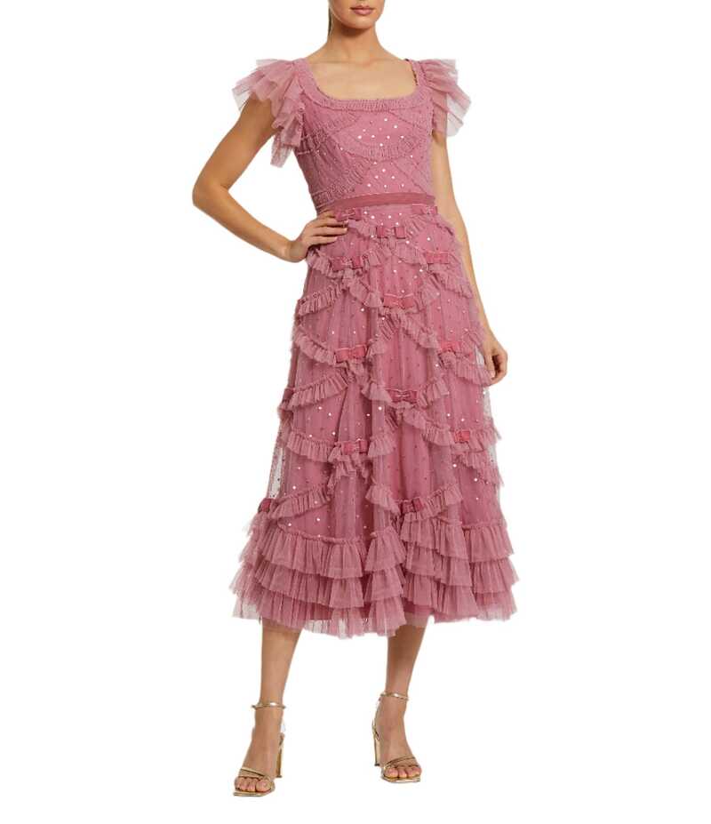 マックダガル レディース トップス ワンピース ミディワンピース フリル メッシュ ミディ スパンコール Mac Duggal Square Neck Ruffle Shoulder Dotted Sequined Mesh Micro Ruffle Bow Midi Dress Antique Rose