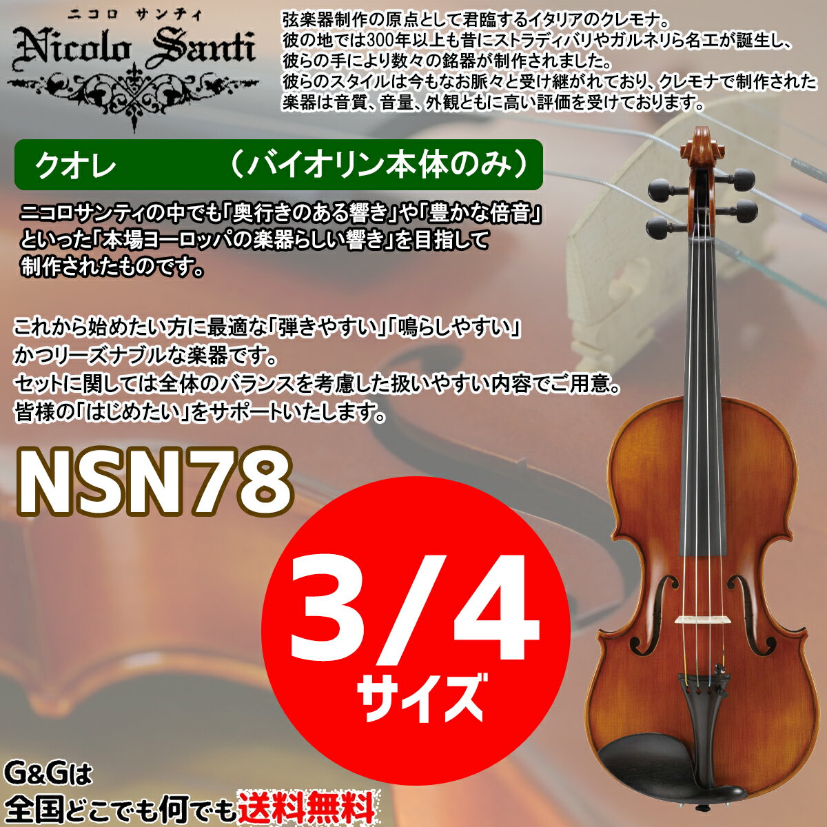 トピックスショッピングクレジット分割48回払いまで金利手数料0%!期間限定 2026年2月28日まで30,000円(税込)以上のお買い物が対象となります。本キャンペーンはクレジットカードでのお支払いは対象外となります。詳しくはお問い合わせください。アイテム説明弦楽器制作の原点として君臨するイタリアのクレモナ。彼の地では300年以上も昔にストラディバリやガルネリら名工が誕生し、彼らの手により数々の銘器が制作されました。彼らのスタイルは今もなお脈々と受け継がれており、クレモナで制作された楽器は音質、音量、外観ともに高い評価を受けております。しかしながら大変高価であり容易には手に入らないのが現実です。音楽に興味を持ち楽器を始めたいけれども、高価で簡単には入手できない。しかしただ安いだけの粗悪な楽器はいらない。こうした皆様のご要望にお応えして、クレモナ製の楽器のような輝かしく力強い音色を目指したオリジナルブランドNicolo Santi(ニコロ サンティ)を創設しました。弦楽器への憧れ、素晴らしい音楽の世界へNicolo Santi(ニコロ サンティ)と一緒に一歩踏み出してみませんか?■Cuoreグレードこれから始めたい方に最適な「弾きやすい」「鳴らしやすい」かつリーズナブルな楽器です。セットに関しては全体のバランスを考慮した扱いやすい内容でご用意。皆様の「はじめたい」をサポートいたします。<セット内容>・本体 : NSN78・ケース : セミハードケースTRC-100・弓 : E.Noel・肩当て : VSR-200・松脂 : ハイダージン 3Vスペック■サイズ : 4/4、3/4、1/2■表板 : 上級スプルース■裏板、側板、ネック : 上級メイプル *裏板は「1枚板」■指板 : エボニー■糸巻き、あご当て、テールピース : エボニー■弦 : ゴールドブロカット(E)、ドミナント(A、D、G)※サンプル画像になります。実際の木目など異なります。納期について売却時は迅速に商品情報の削除を心掛けておりますが、ショッピングページの更新までにタイムラグが生じ、ご注文のタイミングによっては商品のご用意ができない場合がございます。あらかじめご了承くださいますようお願い申し上げます。最強配送対象商品以外、納期のご確認はご注文前に「商品についての問合わせ」よりお問い合わせください。