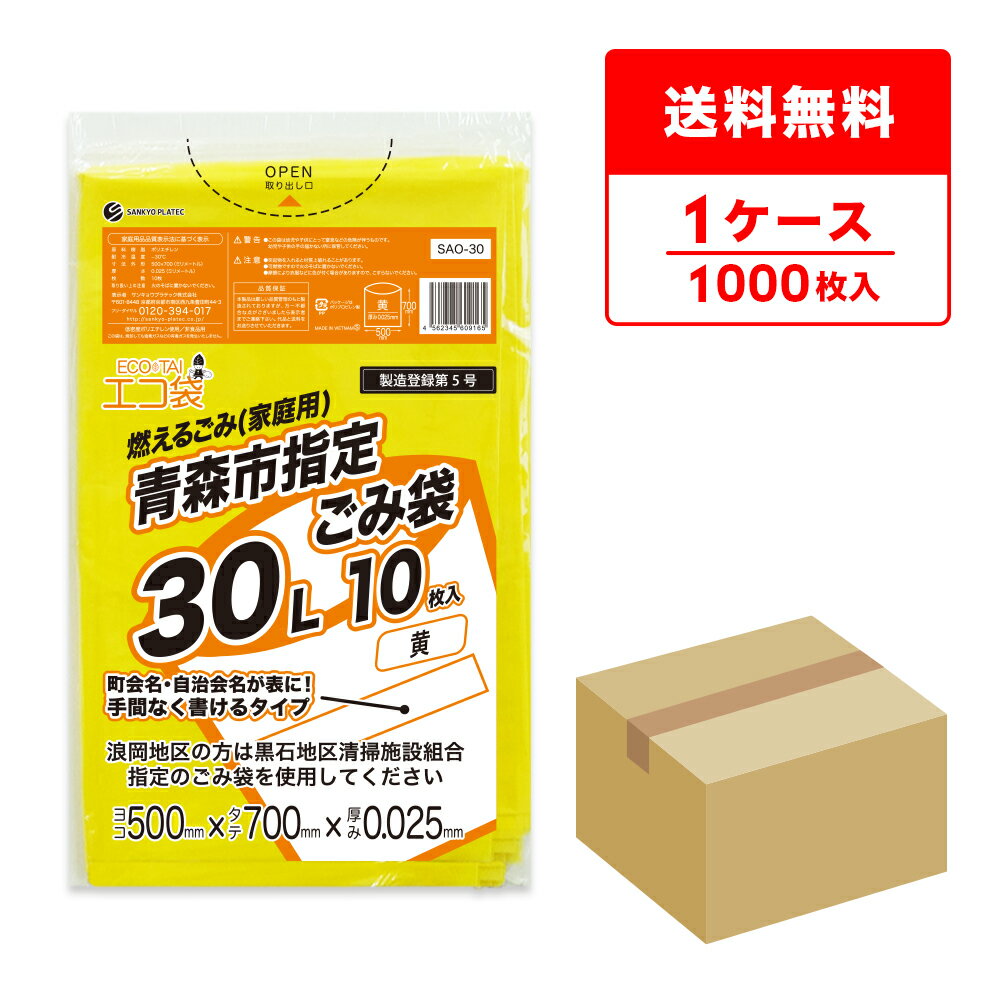 エントリーでP10倍★20日20:00〜27日1:59まで 青森市指定ごみ袋 燃えるごみ(家庭用) 30リットル 黄 50x70cm 0.025mm厚 10枚x100冊 SAO-30/ポリ袋 ゴミ袋 ごみ袋 袋 青森市 指定袋 エコ袋 サンキョウプラテック 送料無料 即納