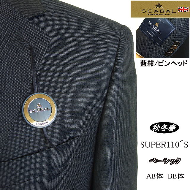 【SCABAL スキャバル】【秋冬春】ネイビー系(藍紺)無地調ピンヘッド ベーシックタイプ【AB体】【BB体】【日本製】2ボタンシングルスーツロゴ入り裏地【送料無料】