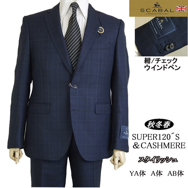 限定【YA7】【SCABAL スキャバル】【秋冬春】紺系格子 スタイリッシュタイプカシミヤ混【日本製】2ボタンシングルスーツロゴ入り裏地【送料無料】