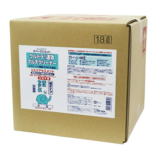 商品名オーブテック スペースショット ウルトラ!速効マルチクリーナー18L製造販売元オーブテックサイズ297×297×288mm内容量18L特徴「ウルトラ!速効マルチクリーナー」の特長1. 手肌にやさしく安全性が高い石油系の原料を一切使用しておらず、トウモロコシ・ココナッツなどの天然成分を原料にしているので、手にやさしい。浄化槽のバクテリアが死なない。生分解性90%以上。 2. 水洗い不要洗浄後は汚水を回収すればOK。水拭き、二度拭きの手間がはぶける。作業効率が上がり、清掃時間の削減。 3. 大幅なコストダウン上下水道代・電気代が1/3〜1/5。大幅に作業時間が短縮されコストダウンになる。 4. 中和剤不要汚水は、バクテリアの働きで中性になるので中和剤不要。 5. 乾燥した方が落ちる洗剤成分が乾燥した方が良く落ちる。10分〜数時間漬け置いてもトラブルはない。 6. ほとんどの素材に使用可能。繊維、石材、金属、ゴム(ベルト)などが腐食・変色・硬化しない。一般的な洗剤では使用不可能な素材にも使用できます。(例:アルミ、白木、畳、漆器、大理石、机・イス、壁紙など) 7. 消臭・除菌効果(原液使用)汚れを取ると同時に洗浄した箇所の消臭・除菌効果も併せ持つ。消臭:魚・肉のにおいなど。除菌・除去:細菌・ウイルスに対して効果有り(データ有り) 8. 消泡剤不要回収した汚水は泡が立たないので消泡剤不要。コストダウン・作業が短縮になる。 9. 植栽が枯れない草・樹木の根・葉に直接掛かっても枯れない。 10. 養生不要水性塗料(石油系界面活性剤の場合は剥がれる)。ほとんどの素材に使用可能なため、養生不要。用途・換気扇の油汚れに塗布10分後、スポンジ・布等で拭き取ってください。・コンビニの清掃に・スーパーの掃除に注意事項 ●ニス(油性)塗りの木製家具・水で色落ちするものには使用しないでください。●万一、目に入った場合は大量の水で洗い流してください。●直射日光の当たる場所に置かないでください。●色落ち等の心配がある場合は、目立たない部分でテストしてください。●直射日光の当たる場所に置かないでください。●時間が経った汚れや、又は熱湯をかけたり日光で乾燥させた汚れは除去できません。●ワックス床の汚れに使用する時は、10倍以上薄めてください。●天然の原料使用のため沈殿物が生じることがありますが、品質上問題はありません。●子供の手の届く所に置かないでください。▼ 同梱について ▼単品配送です同梱不可 (単品配送品は他商品との同梱ができません) ▼ 代金引換 ▼代金引換決済で購入できます▼ 時間帯指定 ▼不可(業務用便の為、希望に添えない場合があります)▼ この商品の返品について ▼・こちらの商品は【返品不可】な商品です。出荷後お客様のご都合による返品はお受けできません ・化学製品、取寄せ商品、受注生産商品は性質上、お受けできません ・返品についてはお客様サポート「返品・交換・保証について」をご確認頂き、ご注文にお進みください▼ 出荷・配達について ▼ ・業務用の出荷便の為、日曜・祝日配達はお受けできない事があります ・大型商品や大量個口の場合、業務用配送便でのお届けとなり、マンション上階やビル施設内への配達ができず、軒先渡し・車上渡しとなる場合がございます。その場合は受取人様にてお荷物のお受け取りおよび移動をお願い致します。 ・同時に注文する商品によっては、別々の配達便になる場合があります ・環境を配慮し、出荷時の梱包は簡易もしくは無包装となります 「ウルトラ!速効マルチクリーナー」の特長1. 手肌にやさしく安全性が高い2. 水洗い不要3. 大幅なコストダウン4. 中和剤不要5. 乾燥した方が落ちる6. ほとんどの素材に使用可能。7. 消臭・除菌効果(原液使用)8. 消泡剤不要9. 植栽が枯れない10. 養生不要